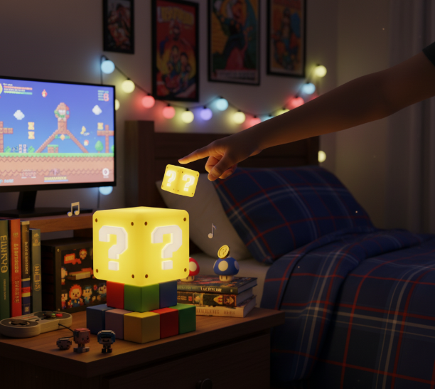La lámpara se enciende y apaga con solo presionar la parte superior del cubo. Al hacerlo, emite un sonido clásico de videojuego y se ilumina con una luz LED cálida.